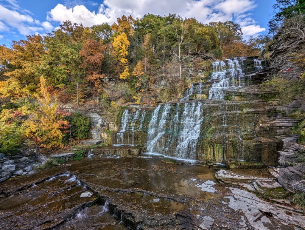 Now this one is fun. If you can get there when the weather is nice and the waterfalls are booming, Enfield Falls yields one of the neatest photo opportunities. The swimming area and diving board are right in front of the falls! It’s still worth it at any time of the year, however. There is a $10 fee to enter Robert H. Treman State Park. Park at the large Gorge Trail Lower Trailhead lot and the falls are only a few minutes away.